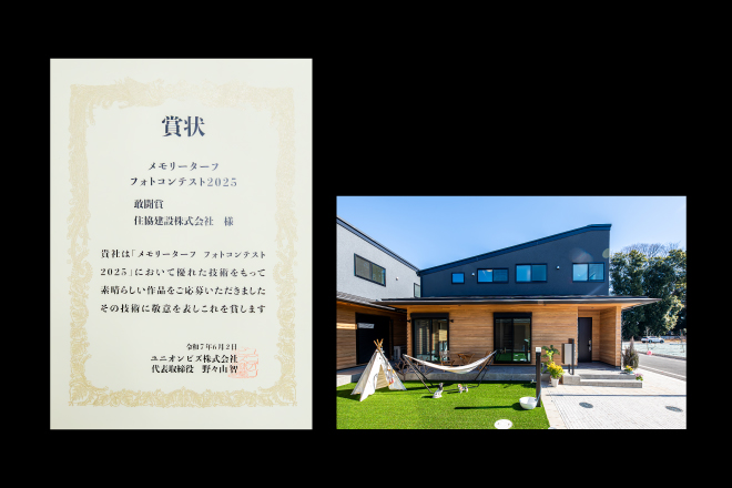 このたび、形状記憶技術を活かした高品質な人工芝で、家庭用からスポーツ競技用途まで幅広く展開しているユニオンビズ株式会社様が主催する「メモリーターフ フォトコンテスト2025」において、住協グループである住協建設株式会社の施工物件が敢闘賞を受賞いたしました。